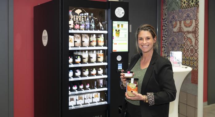 “La crise sanitaire de 2020 nous a secoués. Nous avons alors décidé de développer une activité de plats cuisinés, au travers des P’tits frigos, sous la forme de distributeurs réfrigérés installés en entreprise », raconte-t-elle. Avec ses quatre cuisiniers, Émilie Perret propose donc une large gamme de plats cuisinés conditionnés dans des bocaux en verre. Quelque 250 recettes salées, une centaine sucrées, auxquelles s’ajoute une offre de snacking afin de répondre à tous les goûts et tous les portefeuilles. “Les P’tits Frigos sont implantés dans 13 sociétés, PME, groupements d’entreprises et groupes. Nos produits sont également distribués au sein d’épiceries, comme La Bonne Pioche à Grenoble, et plus ponctuellement auprès de restaurateurs et hôteliers. Et nous sommes actuellement en discussion pour être référencés en grande distribution.”